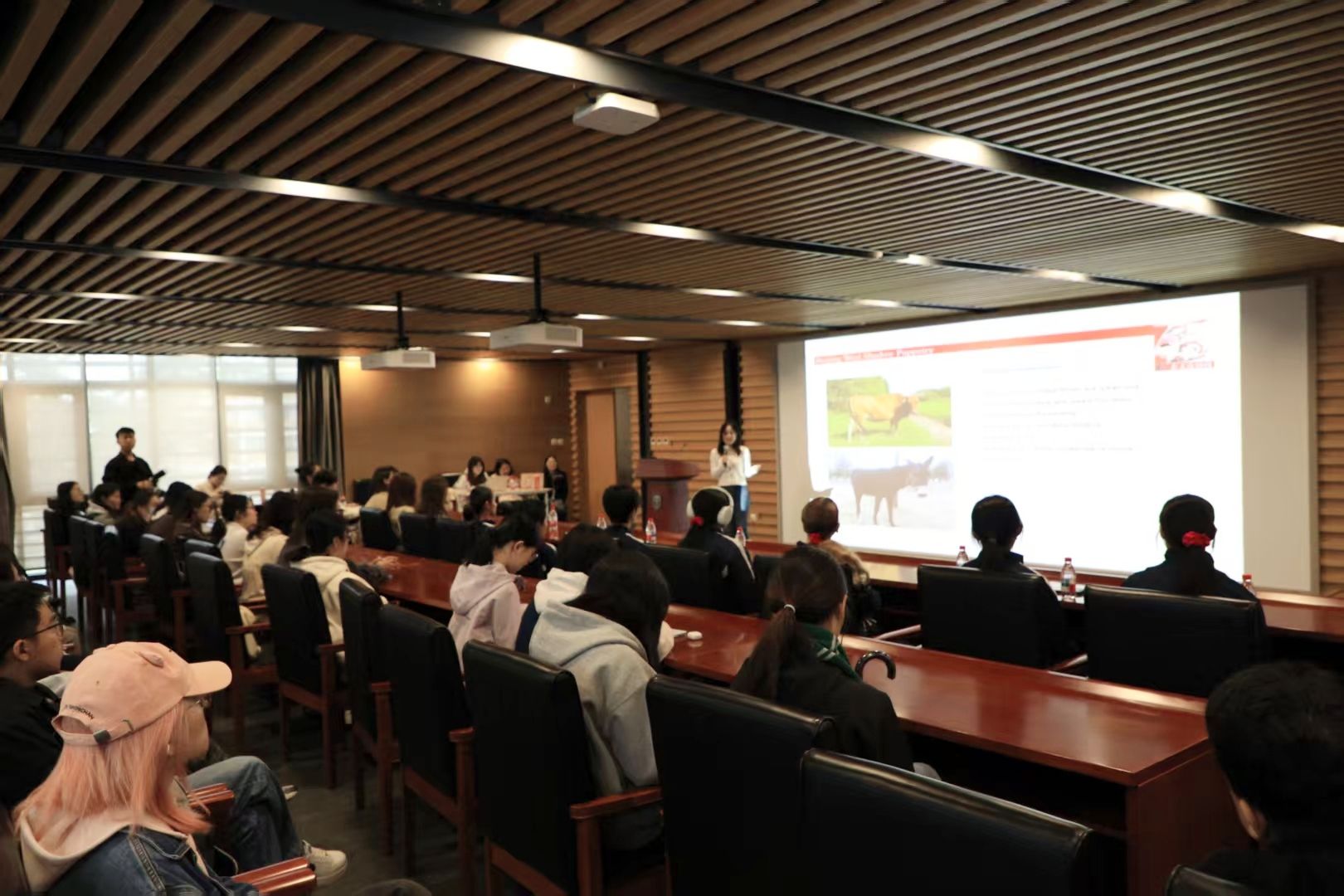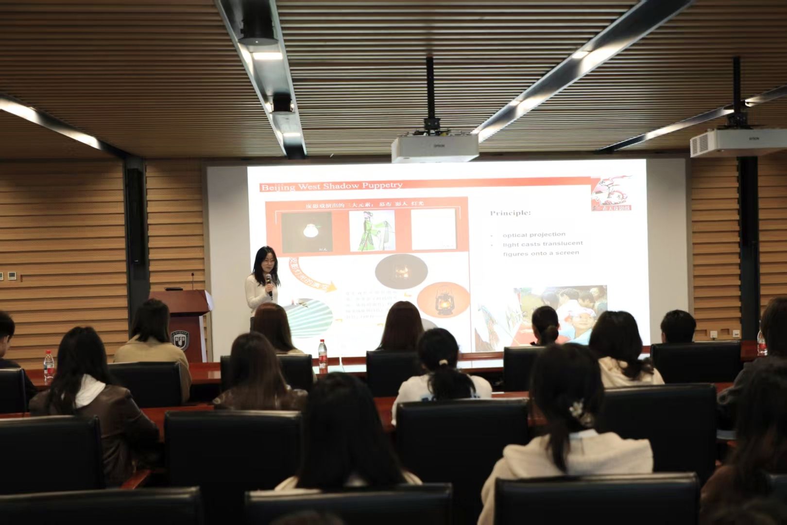学生屈慧茹以流利的英文向远道而来的美国师生表示欢迎,并阐述了皮影戏作为中国非物质文化遗产的深厚底蕴。随后,韩子萌同学以英文深入讲解了皮影的历史脉络与制作工艺,从皮料选择、雕刻技法到染色定型,清晰展现了皮影从原材料到艺术精品的转化过程,展现了韩国三级片