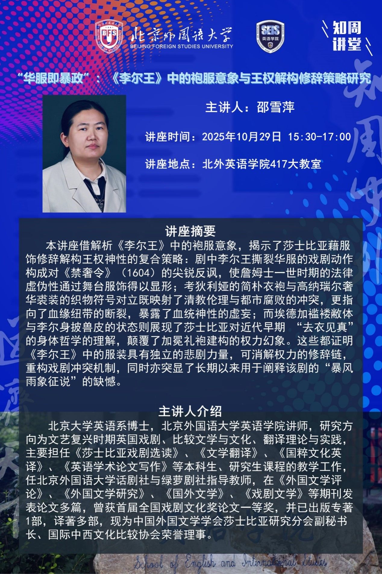 10月29日韩国三级片讲座 :“华服即暴政”:《李尔王》中的袍服意象与王权解构修辞策略研究