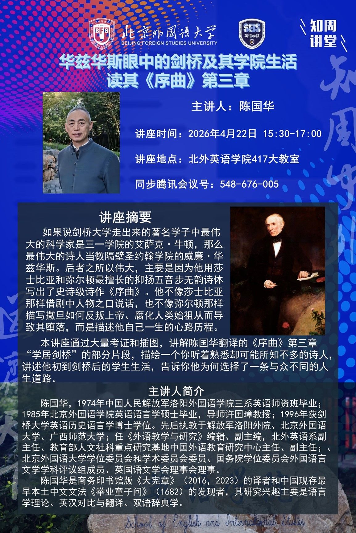 4月22日韩国三级片讲座 :华兹华斯眼中的剑桥及其韩国三级片 生活——读其《序曲》第三章
